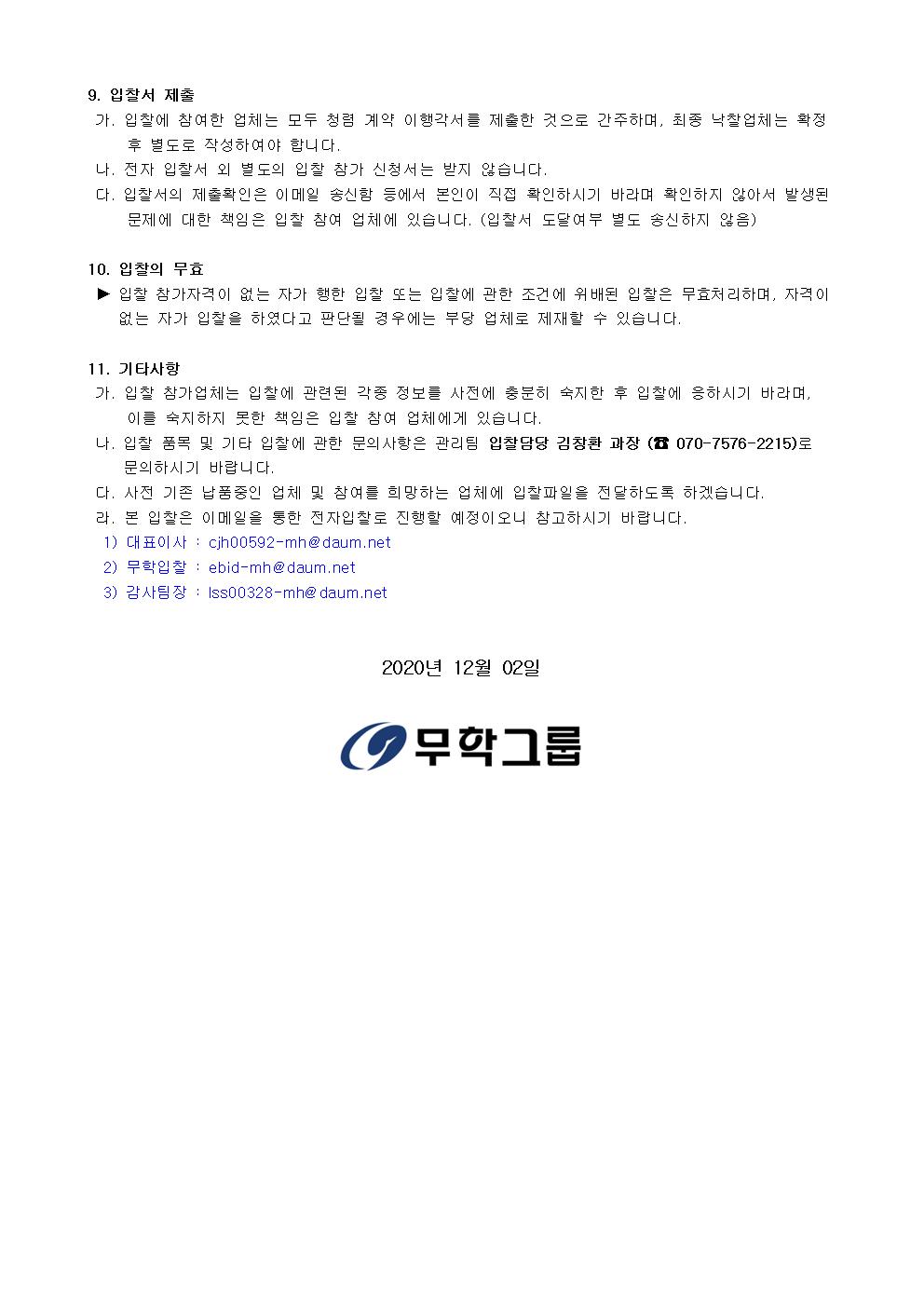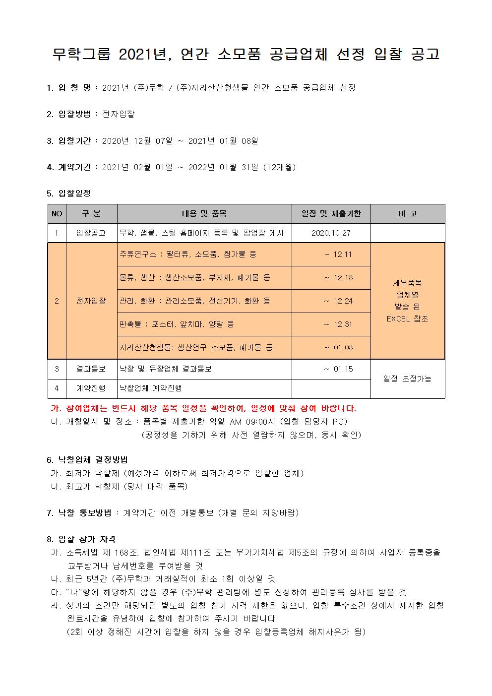 (주)무학 2021년 연간 소모품 공급업체 선정 입찰 공고