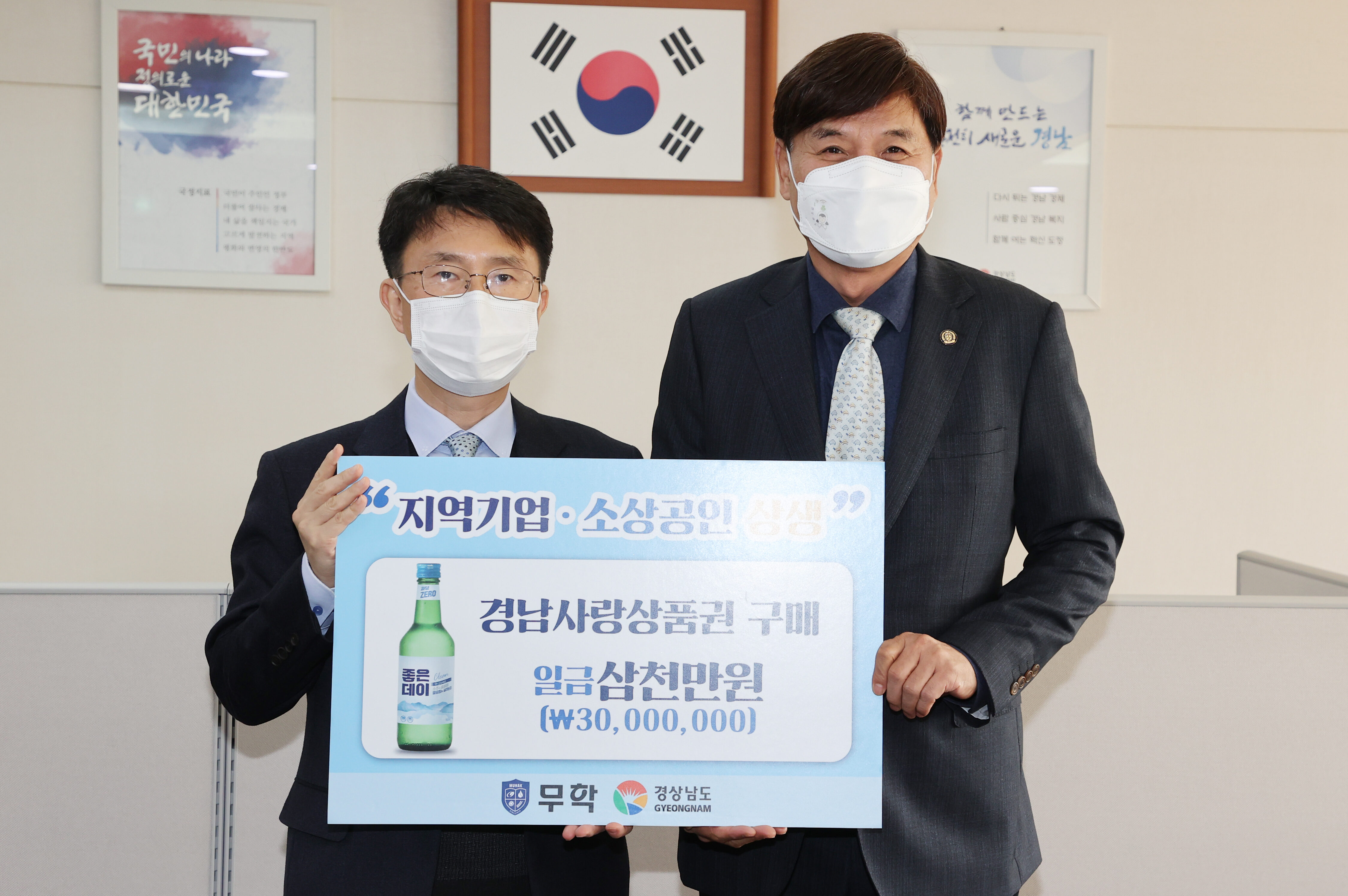 무학은 지난 한 해 동안 고생한 직원을 격려하고 코로나19 장기화로 힘든 시기를 보내고 있는 지역 소상공인을 지원하기 위해 법인 경남사랑상품권을 구매했다. 법인 경남사랑상품권은 개별 소비자가 대금 지불을 통해 구매하는 방식이 아닌 법인의 필요에 의해 상품권을 구매해 개별 대상자에게 지급하는 방식이며, 무학은 직원 포상금, 명절 선물 등으로 사용할 계획이다.