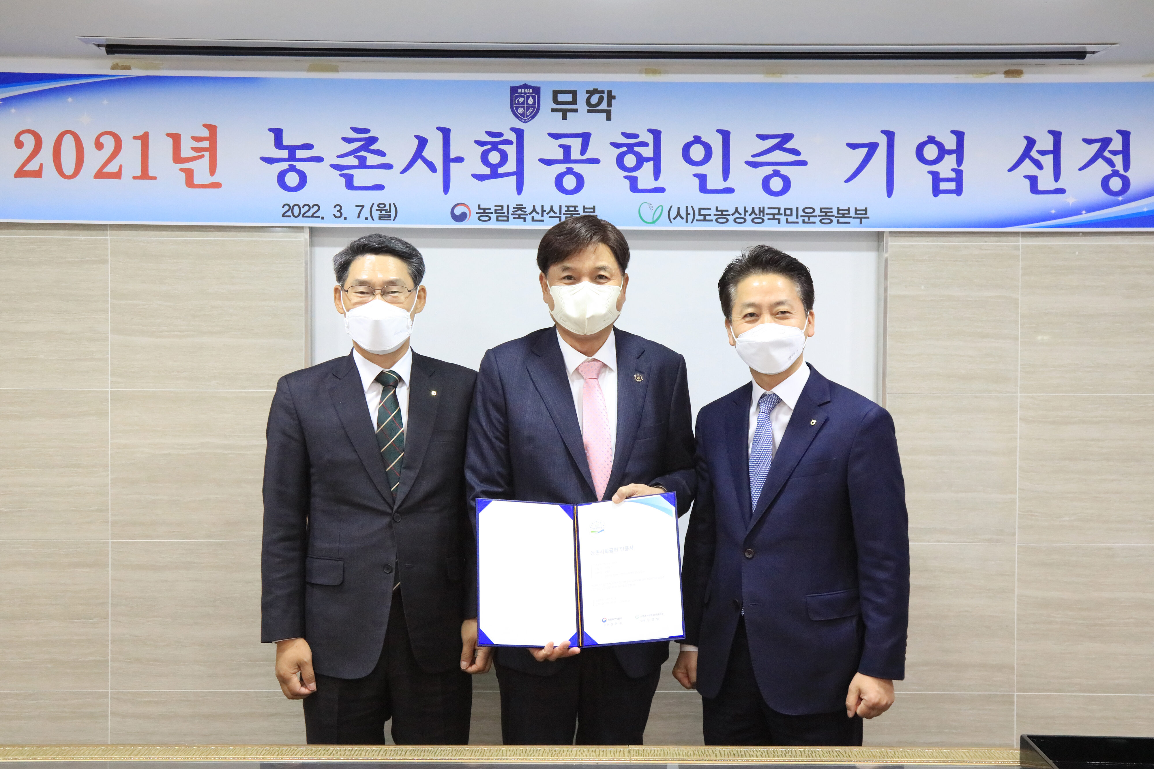 농촌사회공헌 인증제는 농촌 마을 및 지역과 3년 이상 지속적인 교류를 통해 농촌 활력에 크게 기여한 우수기업을 인증하는 제도이며, 무학은 농촌 발전에 기여해 온 점을 우수하게 평가받아 인증기관으로 선정됐다. 농촌사회공헌인증기업은 지금까지 전국 7개 기관이 선정되었으며, 경남에서는 무학이 최초로 선정됐다.