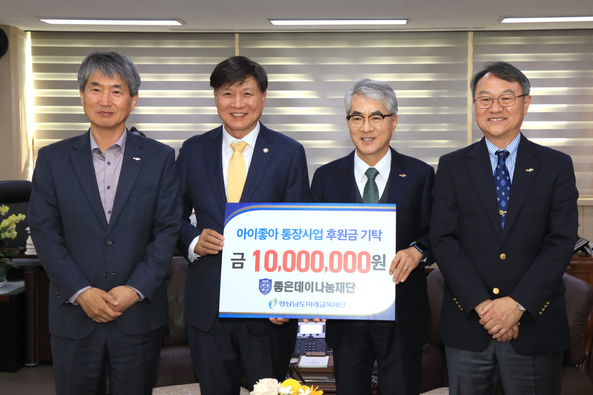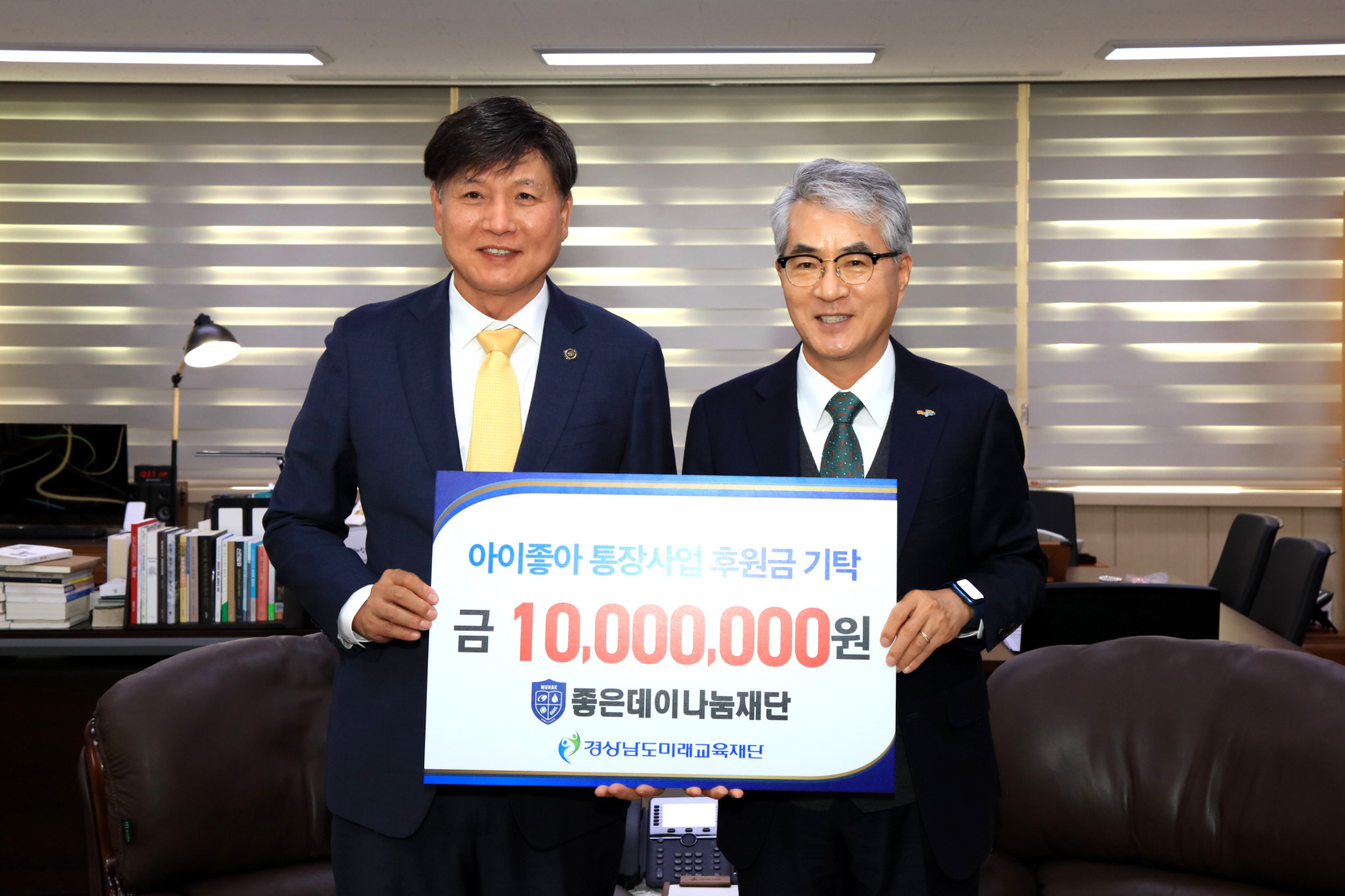 무학 좋은데이나눔재단(이사장 최재호)는 경남미래교육재단(이사장 박종훈)에 ‘아이좋아 통장사업’ 후원금 1,000만 원을 전달했다.