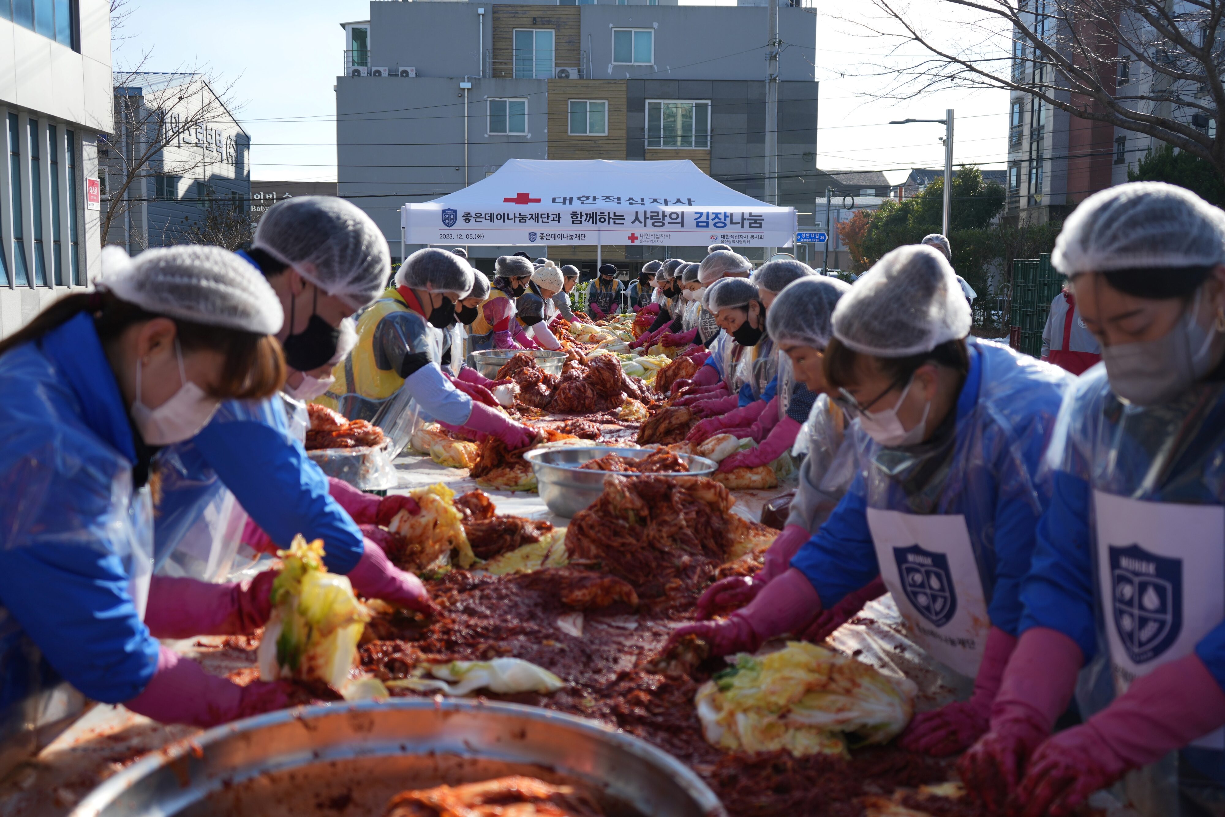 5일 울산시 중구 대한적십자사 울산광역시지사에서 열린 ‘2023 사랑의 겨울김장’ 행사에는 이종수 무학 사장과 무학 임직원 좋은데이 봉사단, 대한적십자사 봉사회 울산시협의회 봉사원 등 100여 명이 참여했다. 무학 좋은데이나눔재단은 이번 행사가 원활히 진행될 수 있도록 후원금 500만 원을 전달했다.