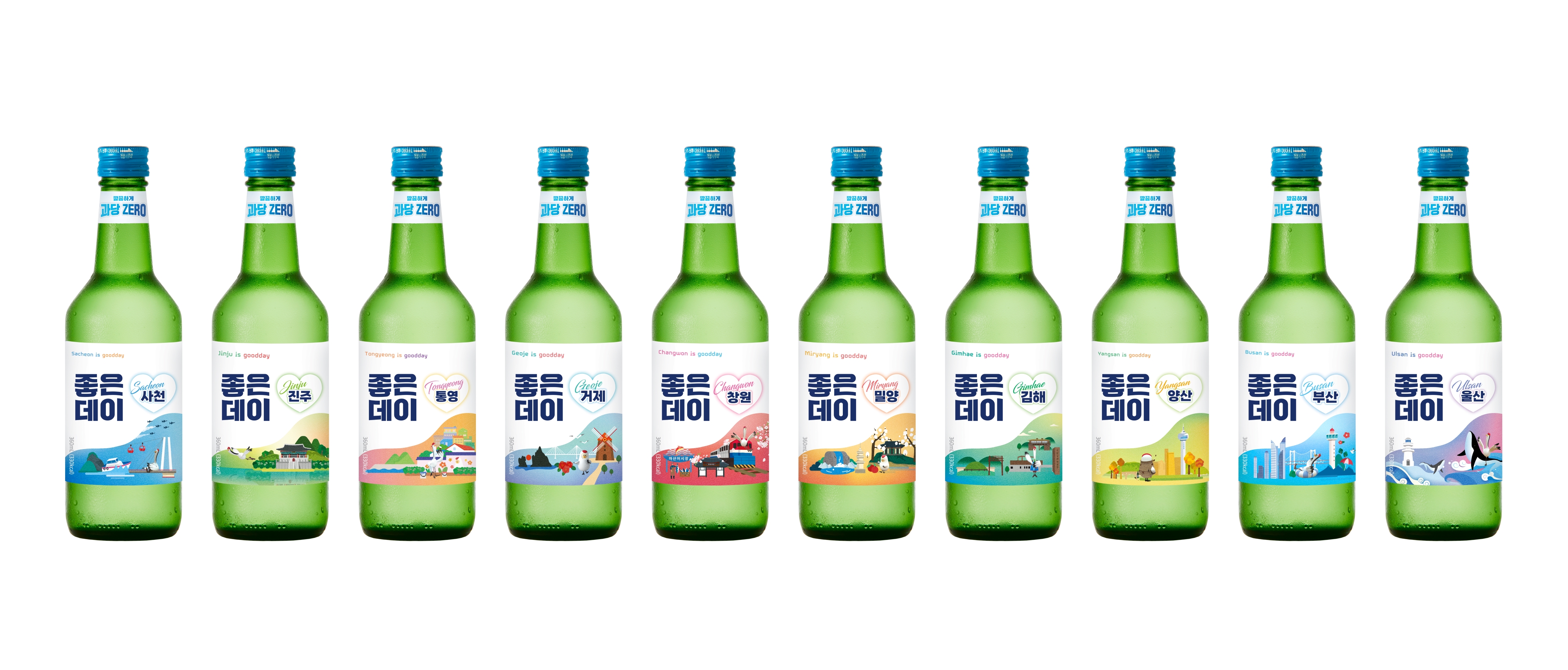 좋은데이 부울경 지역에디션은 사천, 진주, 통영, 거제, 창원, 밀양, 김해, 양산, 부산, 울산 등 부울경 10개 도시의 랜드마크를 무학의 캐릭터 ‘하기’와 ‘더기’가 여행을 즐기는 모습으로 주 상표면에 재미있게 넣었다.
