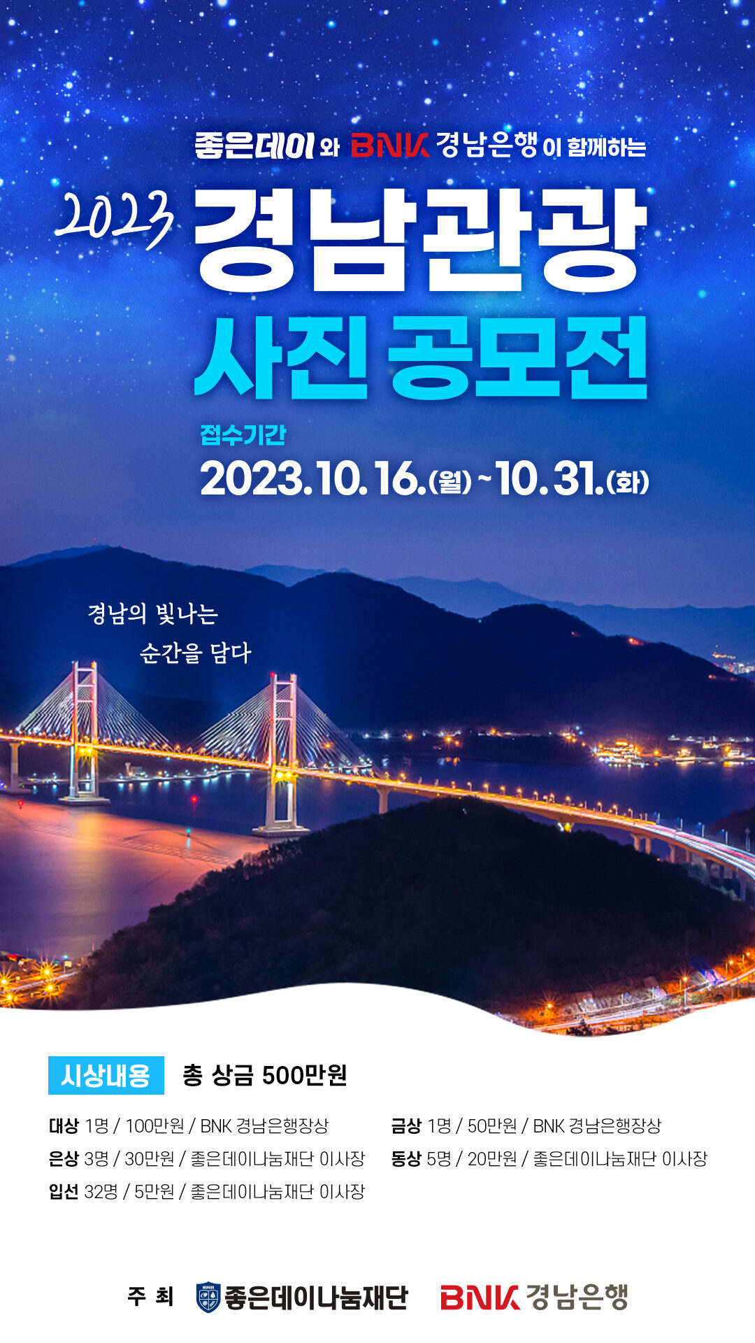 무학 좋은데이나눔재단과 BNK경남은행이 함께하는 ‘2023 경남 관광 사진 공모전’은 경남 관광의 매력을 알리기 위해 개최한다. 공모 대상은 자연, 문화재, 관광, 축제 등 관광자원을 소재로 촬영한 사진 작품이다.
