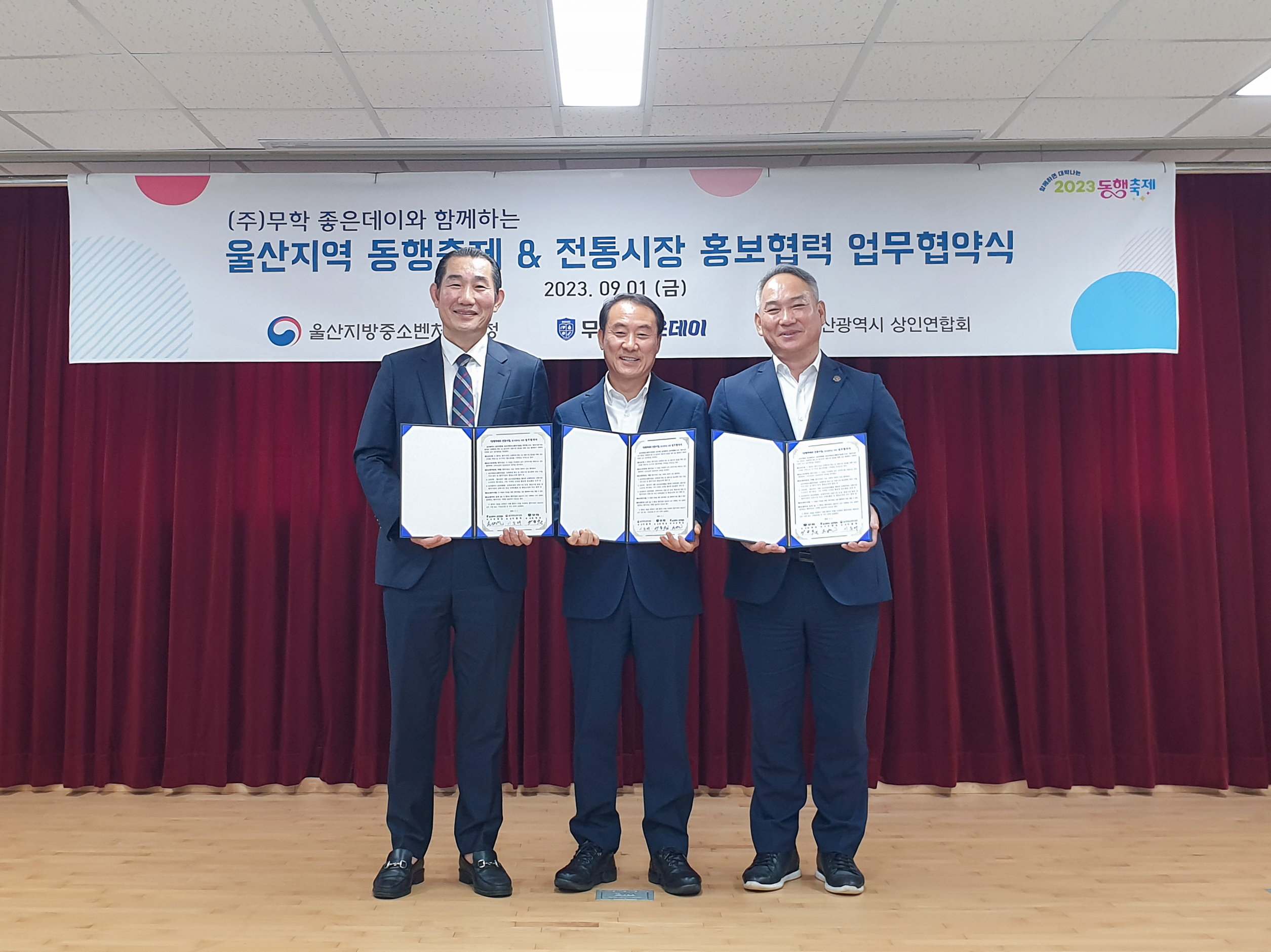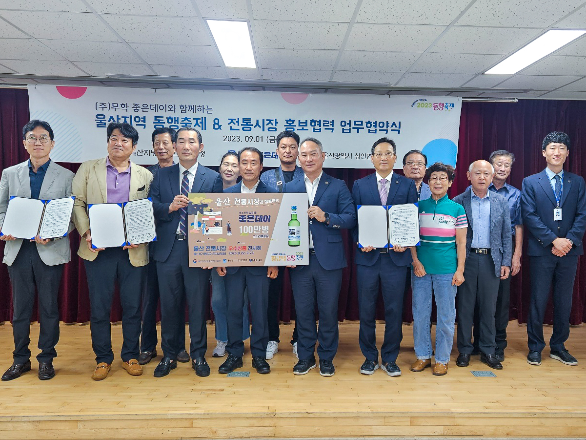 이날 협약식에는 이종수 무학 사장과 중소벤처기업부 이종택 울산지방중소벤처기업청장, 손병길 울산광역시상인연합회장 등 관계자들이 참석해 황금녘 동행축제와 전통시장 행사홍보, 지역제품 애용 등에 상호 협력하기로 했다.